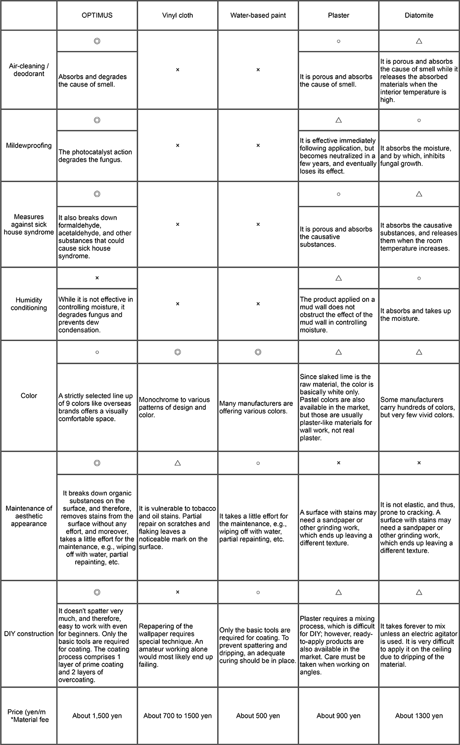 - OPTIMUS has a surface electrical resistance of not greater than 108Ω, preventing electrification, and thus, also highly resistant to dust and dirt. In addition, the photocatalyst breaks down the oil and tar that cause staining, and thus, keeping the wall clean.