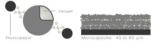 Photocatalyst is a substance that uses absorbed light to generate the active oxygen, and at the same time, provide "degradation" and "superhydrophilic" properties. OPTIMUS successfully applies such properties into practical uses. OPTIMUS degrades organic matters and purifies air when used indoor. Meanwhile, when applied on the exterior wall, OPTIMUS removes stains and dirt out of the painted wall with its self-cleaning properties, and wash it away with rain, maintaining the aesthetic appearance of the building. We are tirelessly improving our technologies concerning photocatalysts; one of our important achievements is to modify the photocatalyst so that it reacts not only to ultraviolet ray but also to visible light (ordinary lamp, etc.). Now it functions more efficiently through its reaction not only to the sunlight but also to fluorescent lamp, LED, and other light source.
